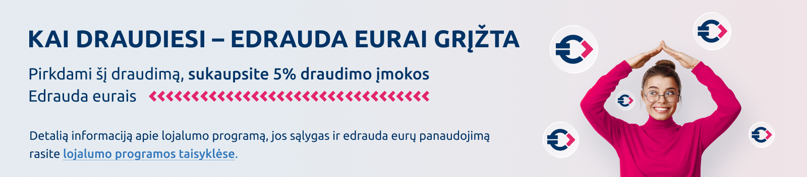 Kiekvieną kartą, kai per Edrauda.lt įsigyjate TPVCA polisą, gaunate Edrauda eurų, kurių vertė yra 5 % nuo draudimo įmokos. Sukauptus Edraudos eurus galite matyti savitarnoje - kada gavote, kiek jų turite ir kur panaudojote. Eurai galioja 24 mėnesius, o juos panaudoti galite perkant kitus draudimo produktus. Kiek procentų sumos galite dengti priklauso nuo draudimo rūšies.